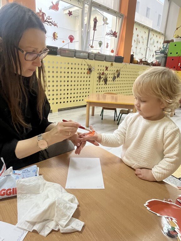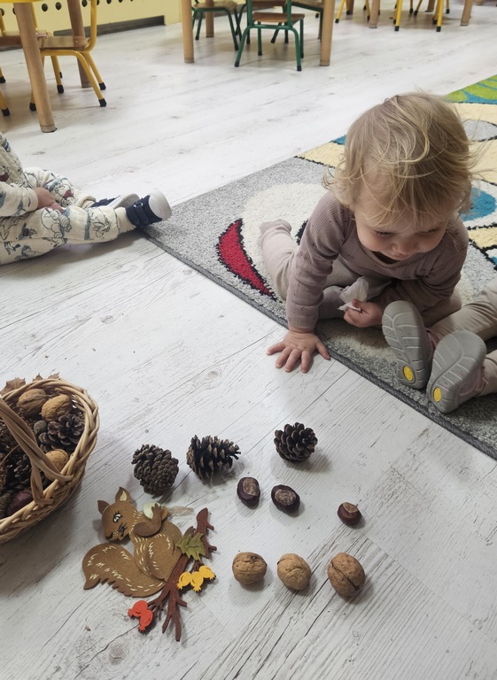 Rudy ogon,pięknie skacze, a orzeszki to jej smaczek…maluszki dziś stworzyły wiewiórki ze swoich rączek. Zabawa sprawiła im wiele radości ponieważ nasze skarby lubią zabawy sensoryczne.