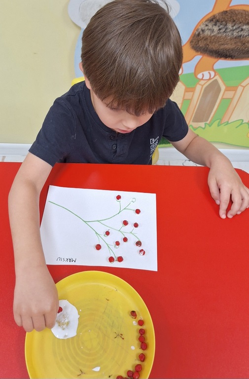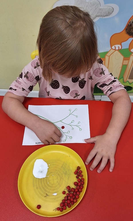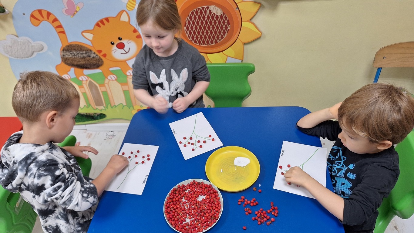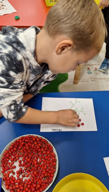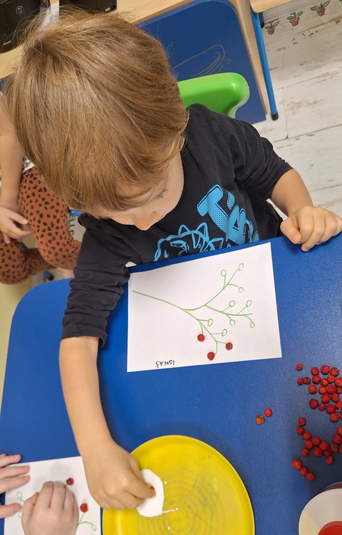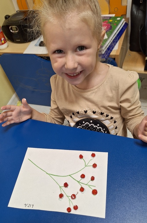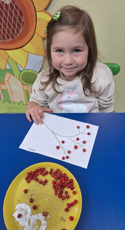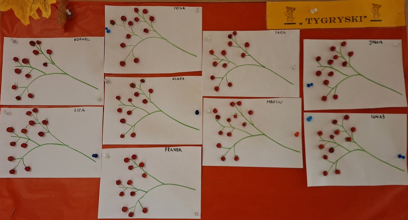 Gałązki jarzębinowe. Dzieci ponaklejały na kartkach owoce jarzębiny na gałązki . Prace wyszły fantastycznie.