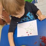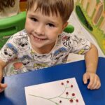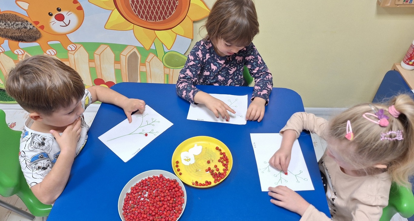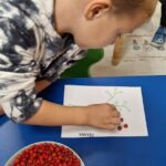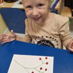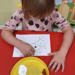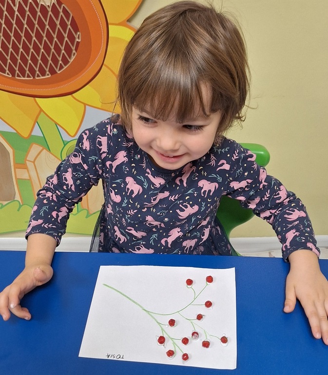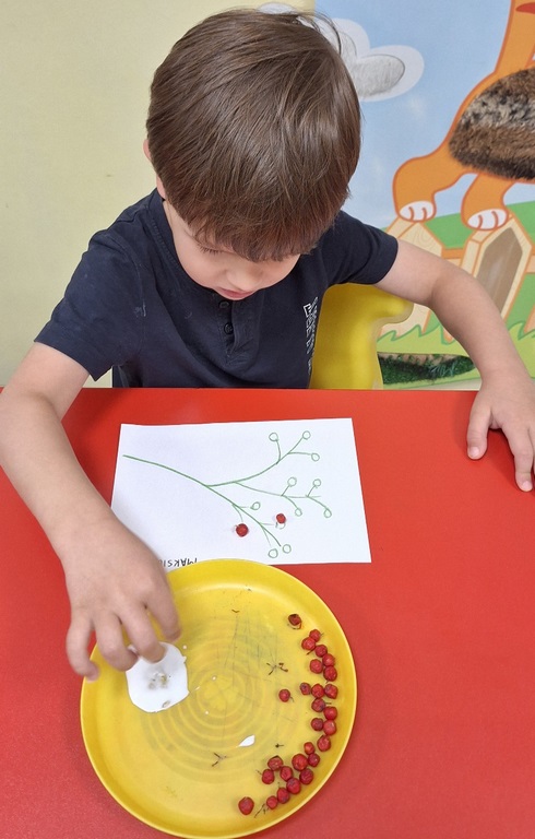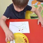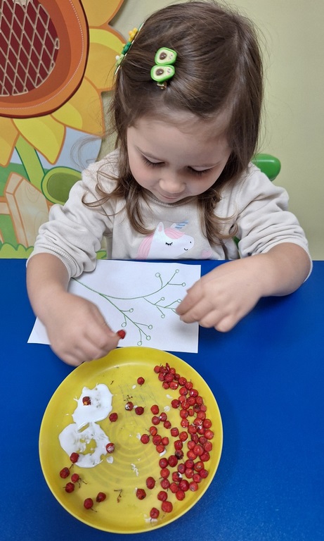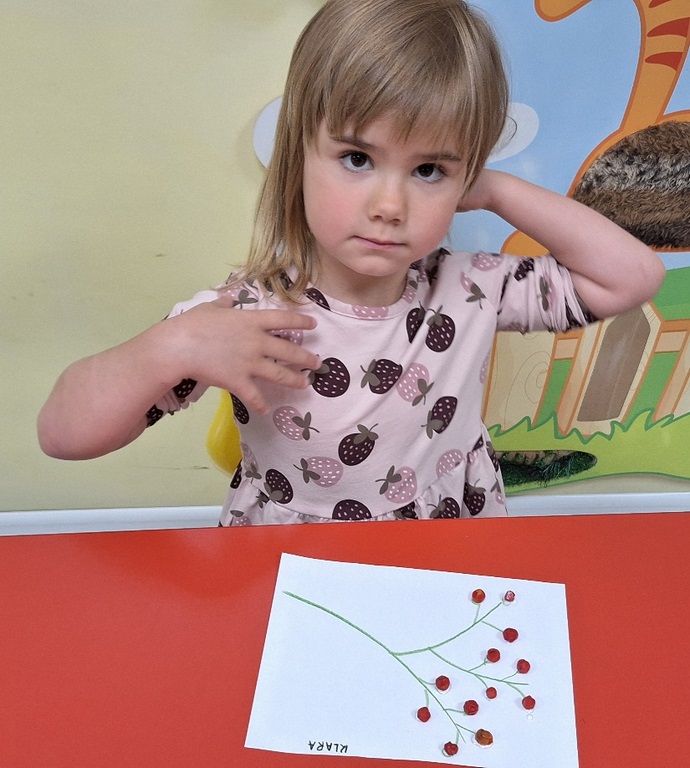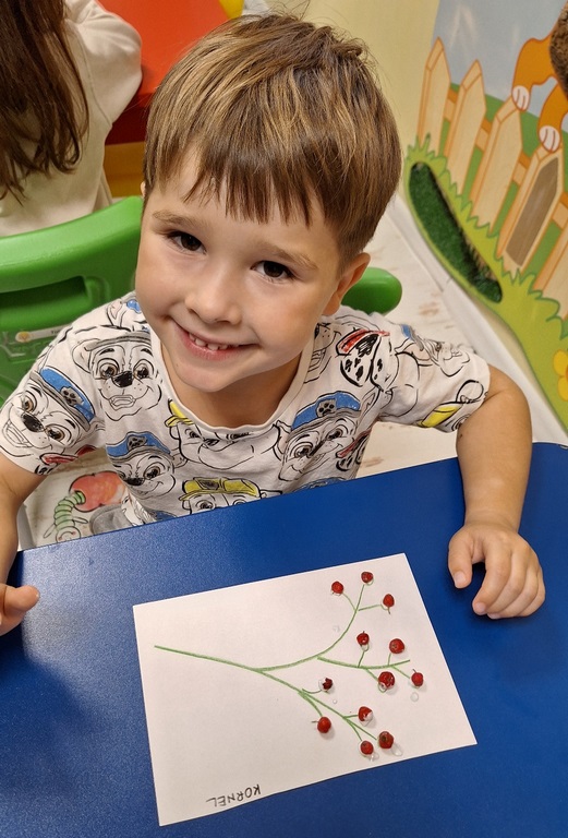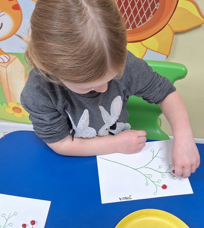 Gałązki jarzębinowe. Dzieci ponaklejały na kartkach owoce jarzębiny na gałązki . Prace wyszły fantastycznie.
