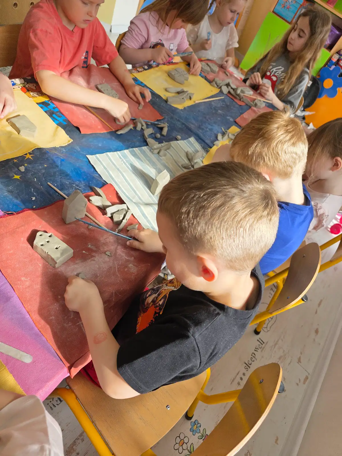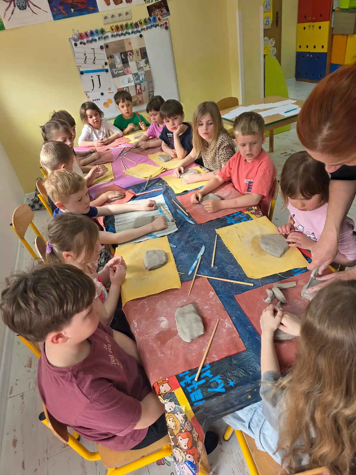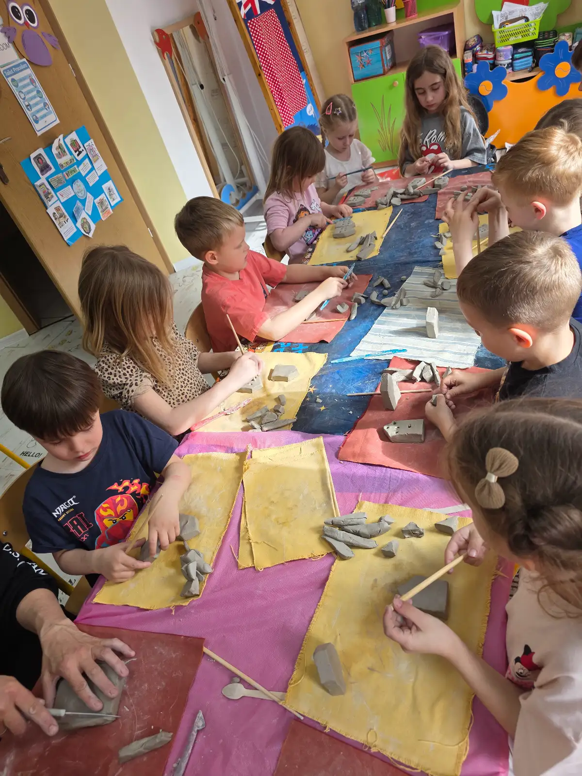 Kolejne spotkanie z Pania Agnieszką i ceramiką. Tym razem robiliśmy domki. Każde dziecko musiało zrobić dwa – jeden zabrała Pani Agnieszka i przygotują dla dzieci niespodziankę. Każdy czeka z niecierpliwością, co to takiego będzie.