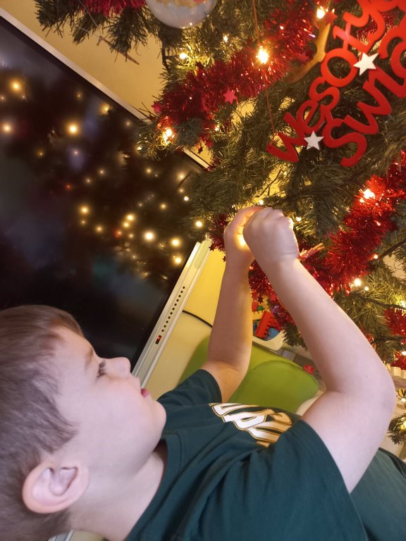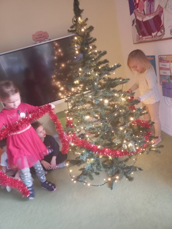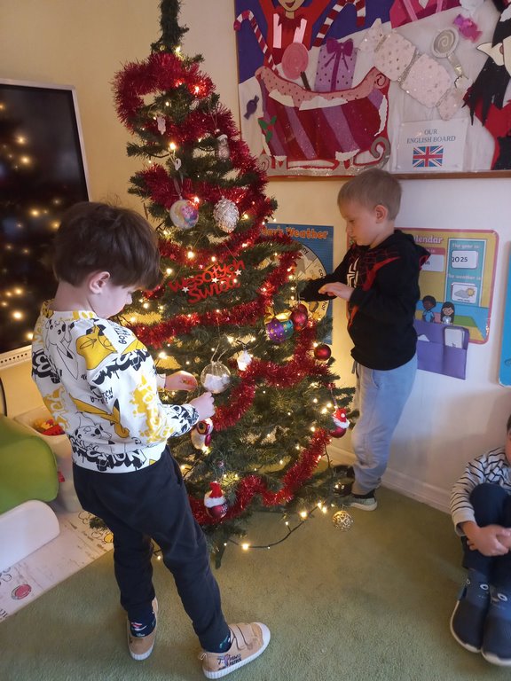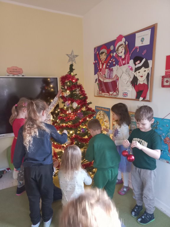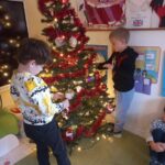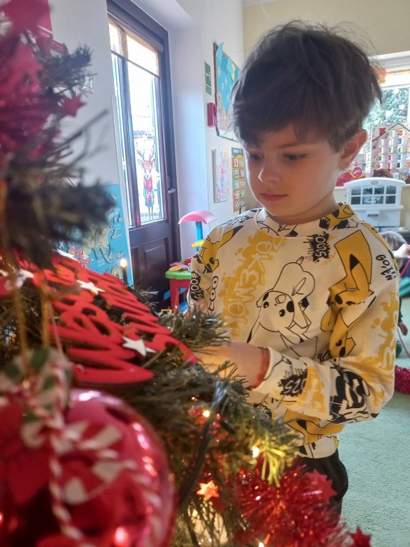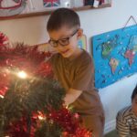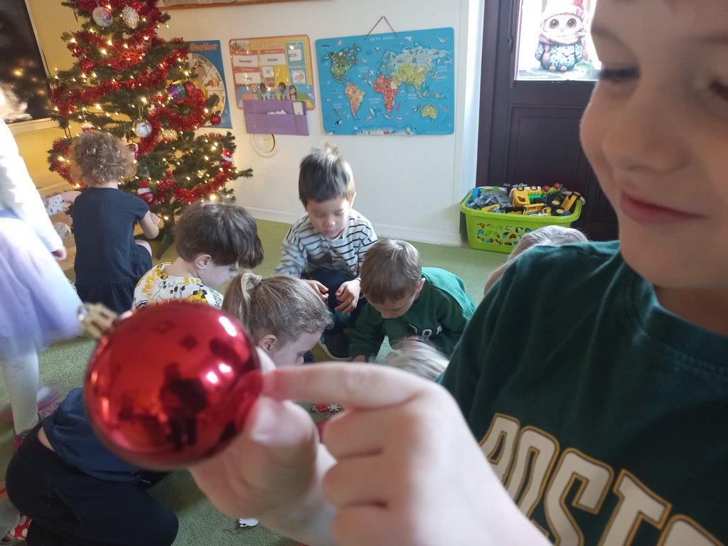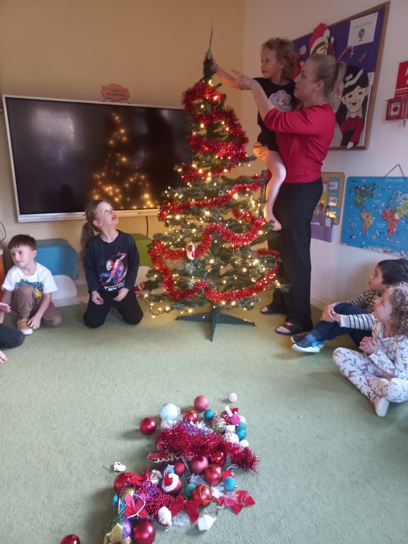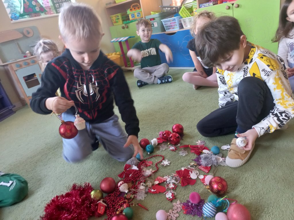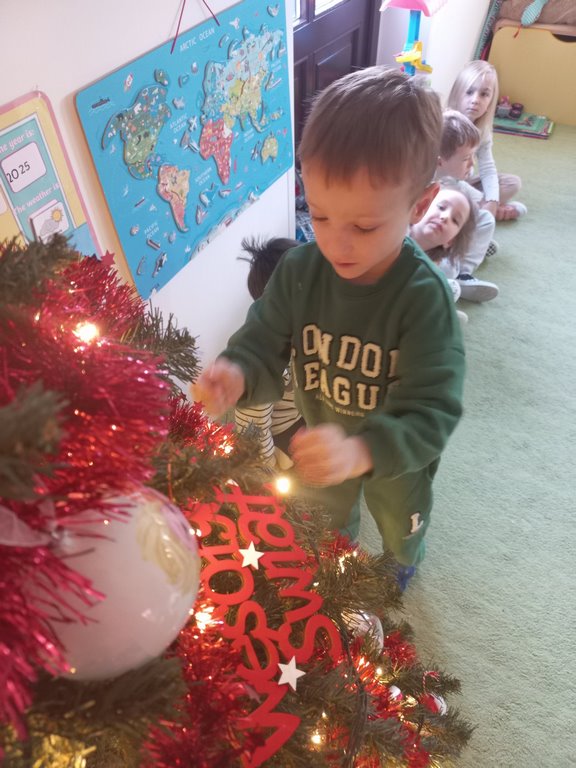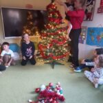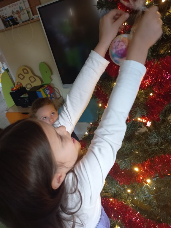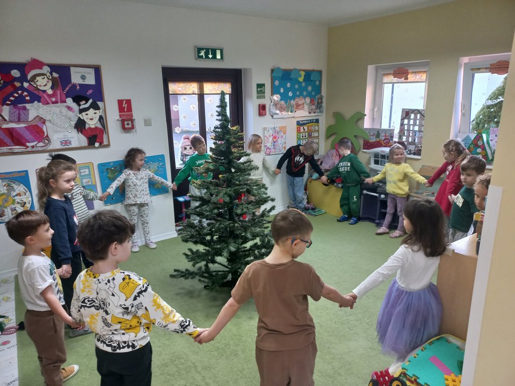 Tydzień mikołajowy w naszym przedszkolu trwa i we wtorek dzieci z grupy Jeżyki miały kolejne świąteczne zadanie. Ubrały naszą przedszkolną choinkę w wiatrołapie, która wita wszystkich wchodzących do naszej placówki zapachem lasu i mruganiem lampek. Dzieci z zadania wywiązały się wzorowo. A wszystkim odwiedzającym naszą galerię życzymy miłego dnia.