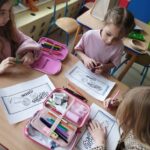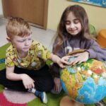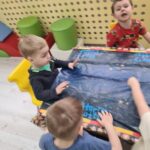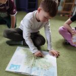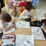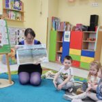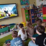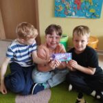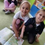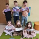 Dzieci przyniosły książki które lubią i okazało się, że dużo dzieci interesuje się budową człowieka – co ma w środku, jak jest zbudowany. W związku z tym wspólnie przy niewielkim udziale pani Tygryski stworzyły ” człowieka” odrysowując go od szkieletu. Następnie dorysowały mu oczy, nos, usta, paznokcie itp. Skupiły się nawet na kolanach człowieka,  któremu wspólnie nadały imię ” Sportuś”. Oprócz książek o anatomii człowieka znalazła się encyklopedia, oceany, media itp.