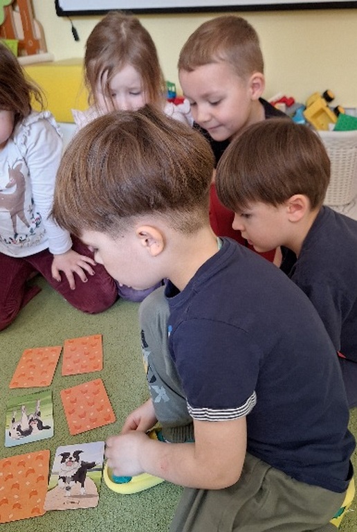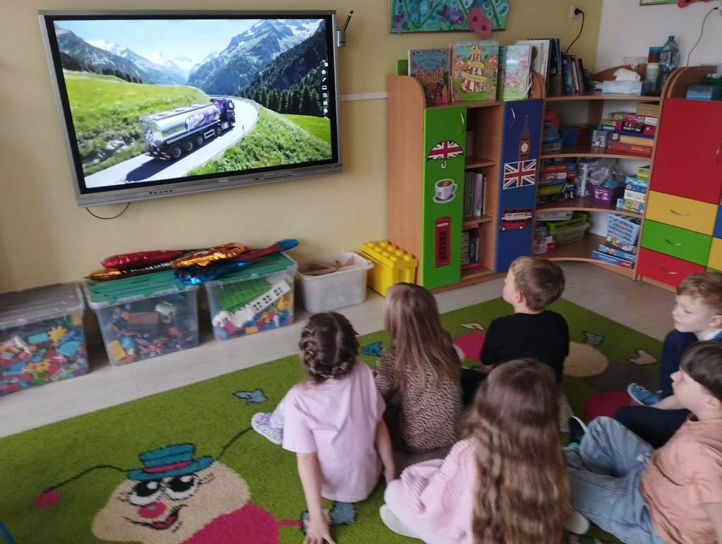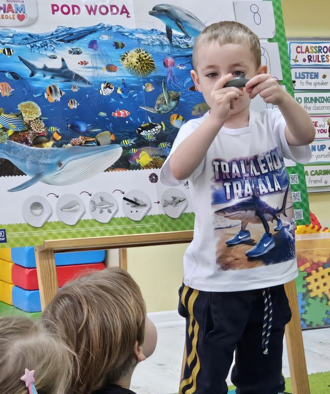 Dzieci przyniosły książki które lubią i okazało się, że dużo dzieci interesuje się budową człowieka – co ma w środku, jak jest zbudowany. W związku z tym wspólnie przy niewielkim udziale pani Tygryski stworzyły ” człowieka” odrysowując go od szkieletu. Następnie dorysowały mu oczy, nos, usta, paznokcie itp. Skupiły się nawet na kolanach człowieka,  któremu wspólnie nadały imię ” Sportuś”. Oprócz książek o anatomii człowieka znalazła się encyklopedia, oceany, media itp.