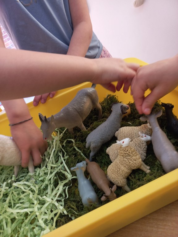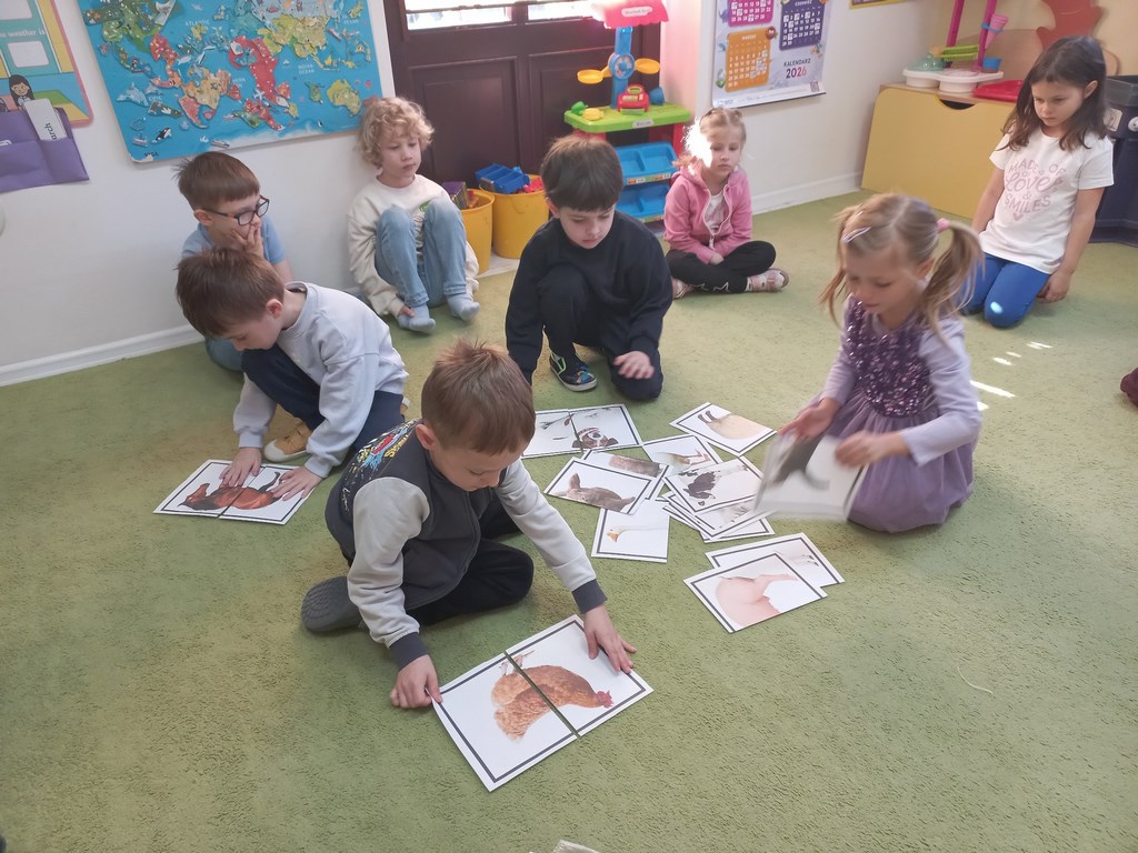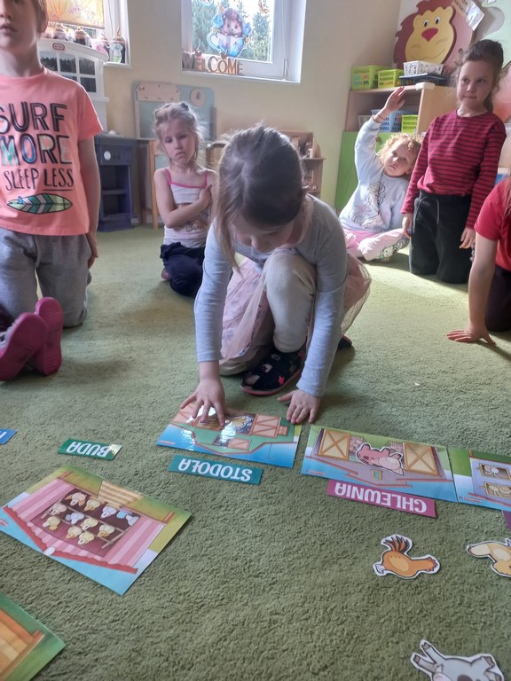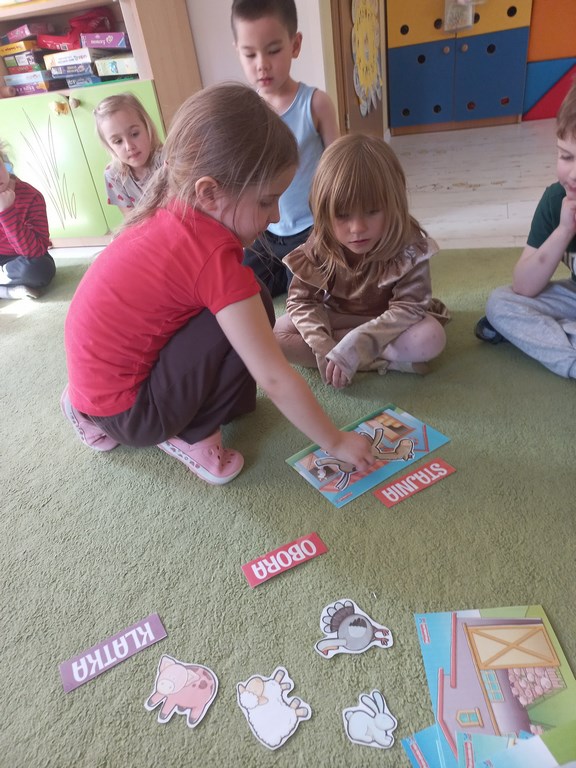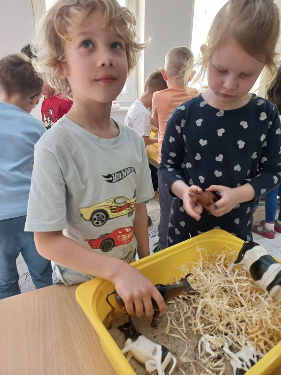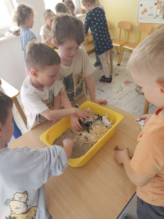 Zajęcia w przedszkolu dotyczące zwierząt na wsi zostały przeprowadzone w formie rozmowy oraz prezentacji ilustracji zwierząt gospodarskich.  Wprowadzono również zabawy sensoryczne, podczas których przedszkolaki rozpoznawały różne faktury i przedmioty związane z tematyką wsi. Dzieci wykonały także  prace plastyczne, utrwalając zdobyte wiadomości i rozwijając swoją wyobraźnię.