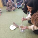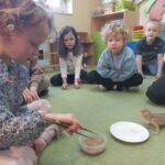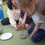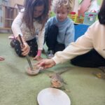 Dzieci robiły z plasteliny wałeczki i obklejały nią grabie. Nie ma to jak wiosenne porządki- grabienie liści.