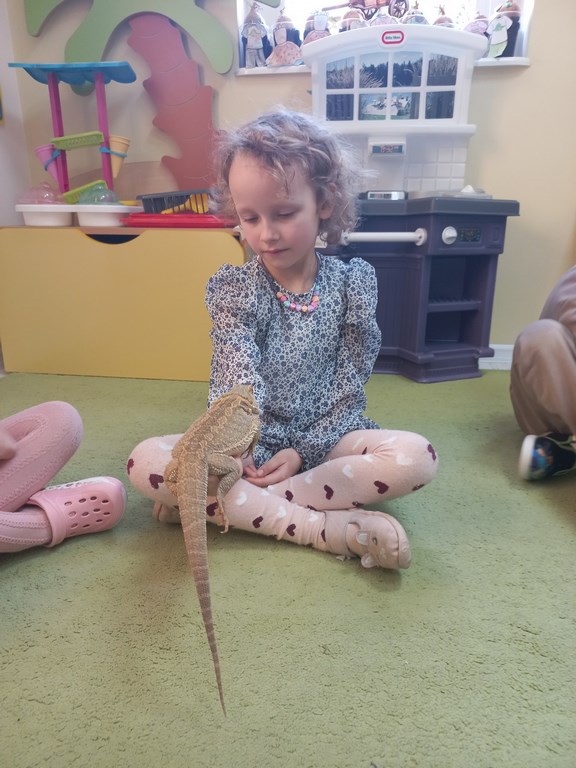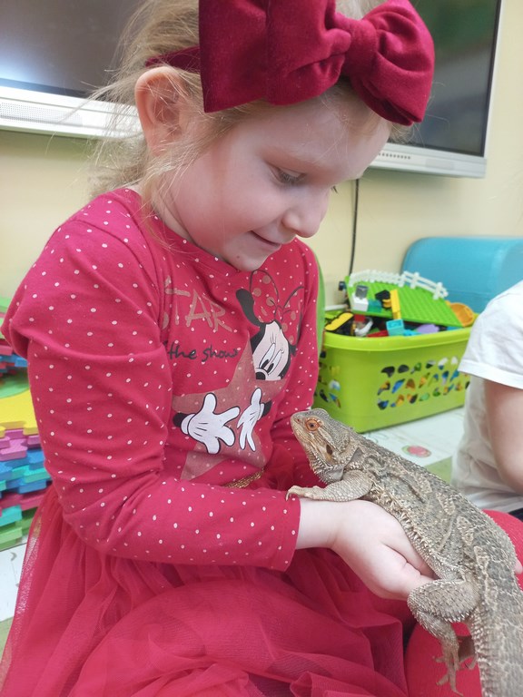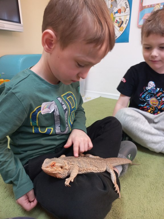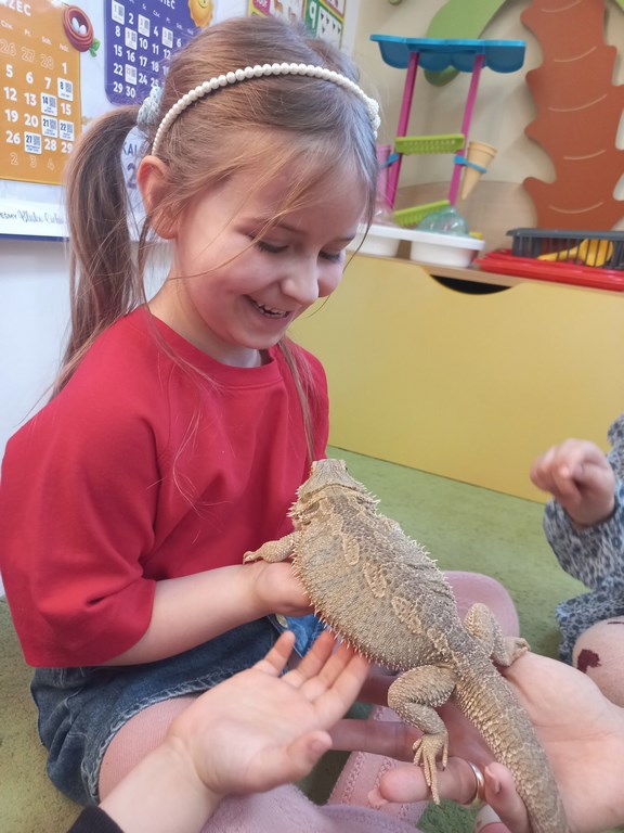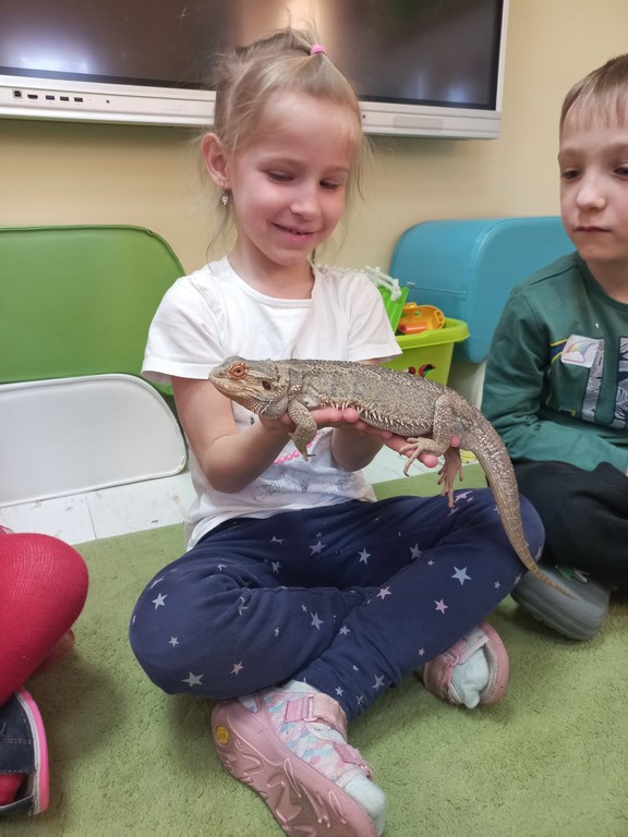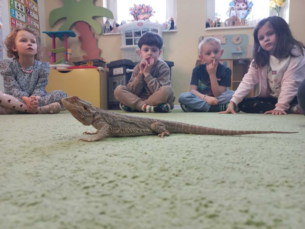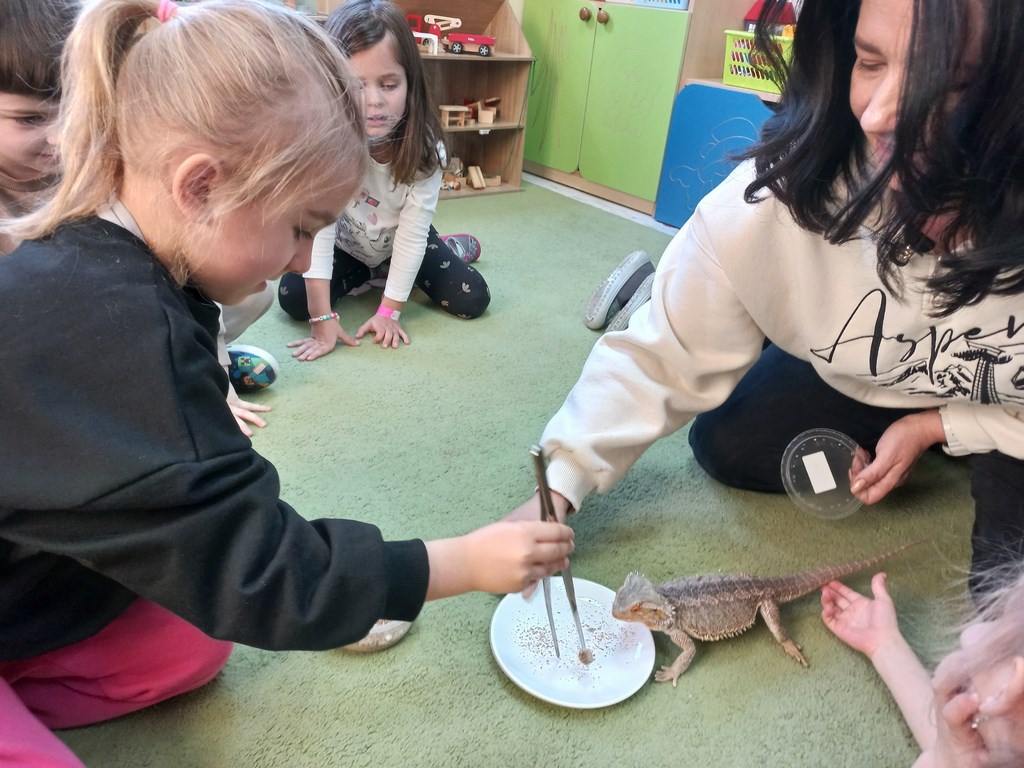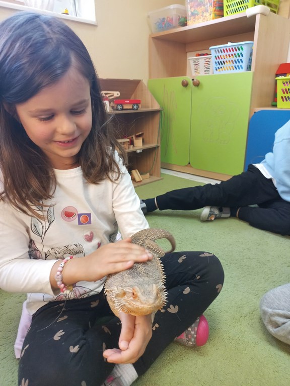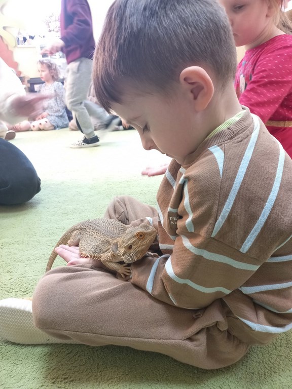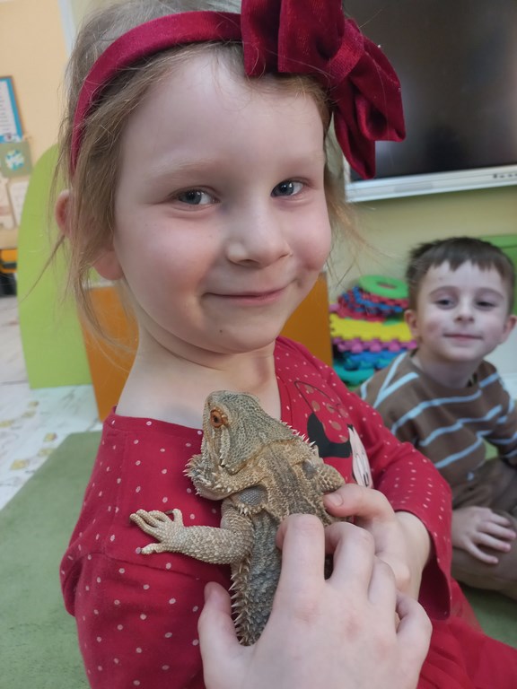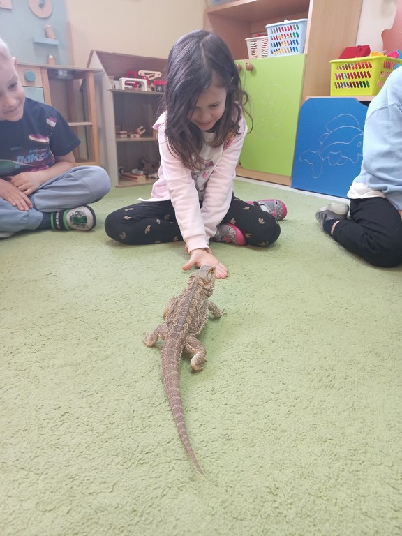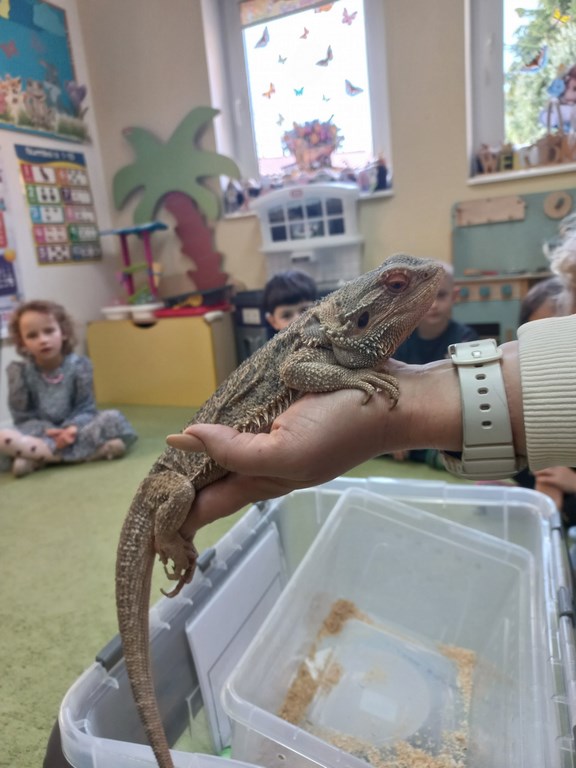 W naszym przedszkolu miało miejsce niezwykłe spotkanie z agamą brodatą. Przedszkolaki wykazały się ogromnym zainteresowaniem, ale jednocześnie były bardzo spokojne, delikatne i uważne w kontakcie ze zwierzątkiem. Z wielką uwagą słuchały ciekawostek i  przestrzegały wszystkich zasad bezpieczeństwa. Dziękujemy Filipkowi i mamie za tą cudowną przygodę ❤️ Wizyta sprawiła wiele emocji i radości, a także była cenną lekcją przyrody w praktyce.