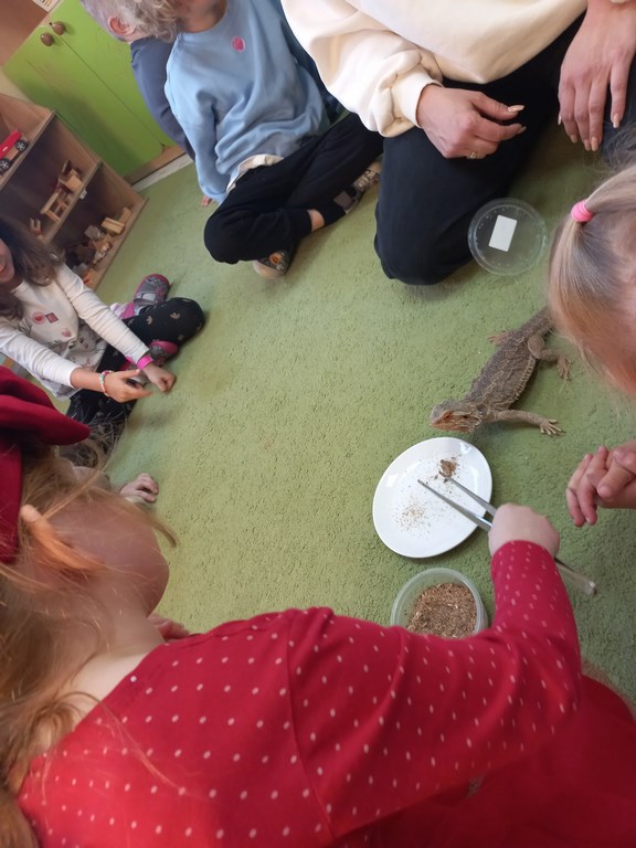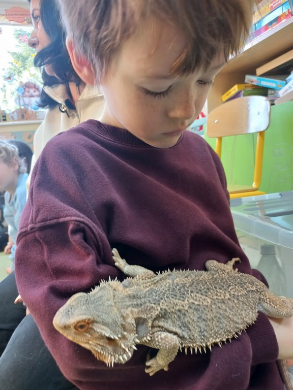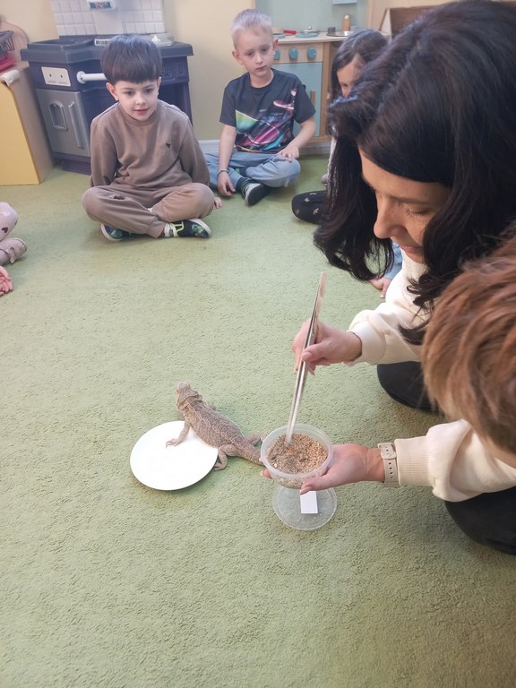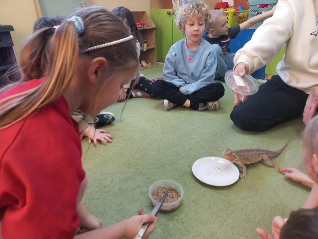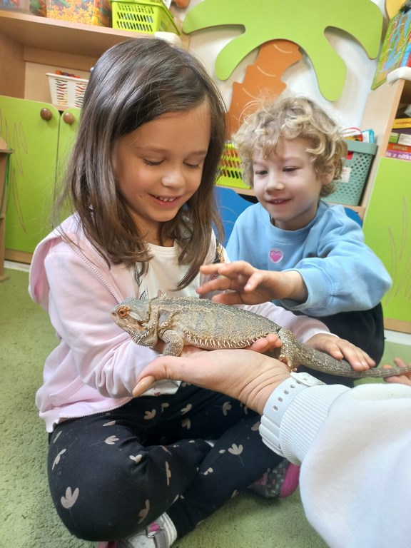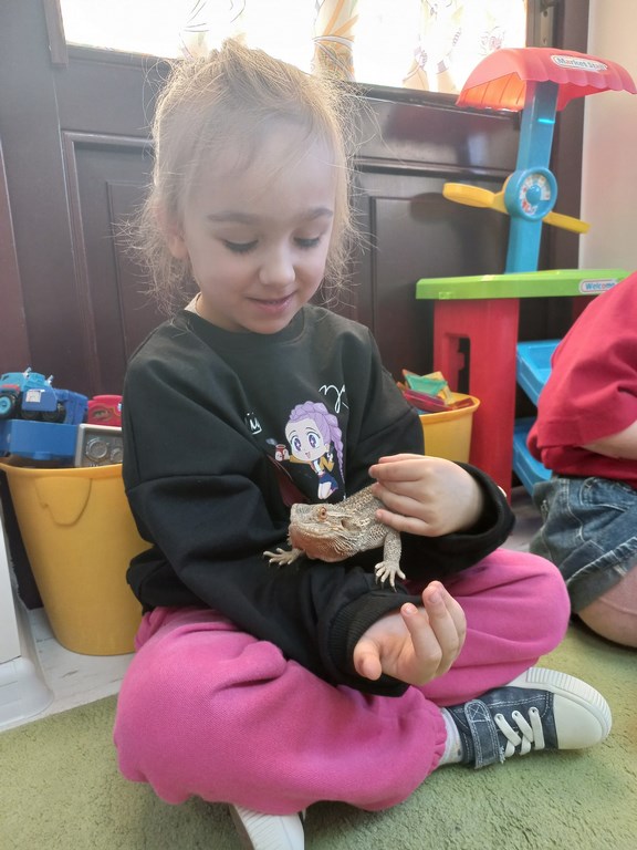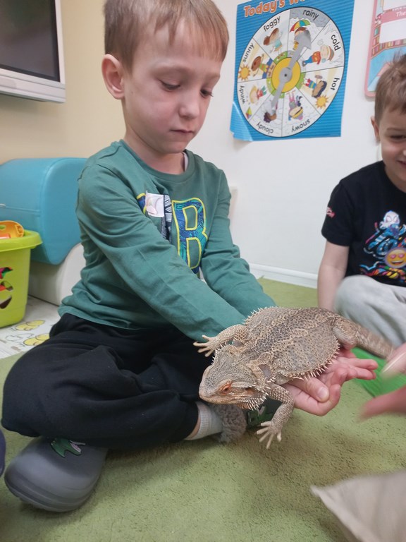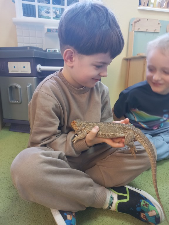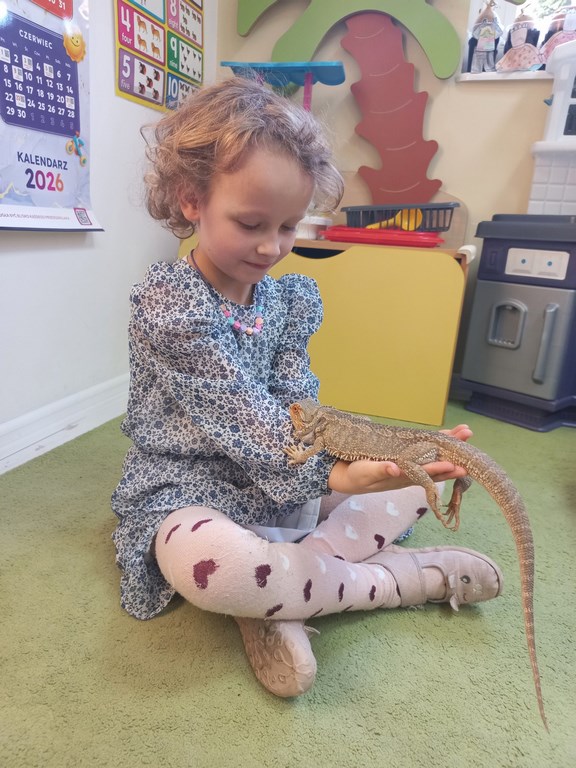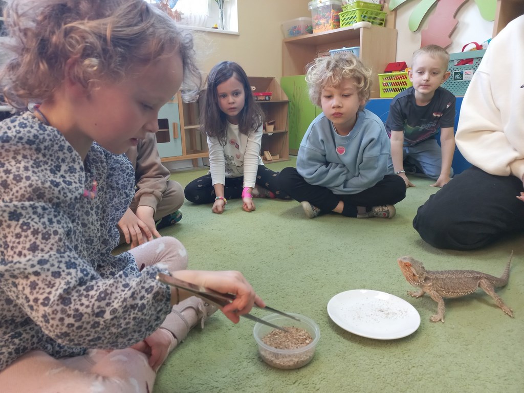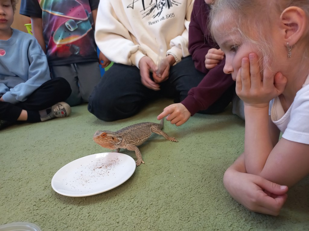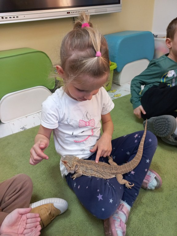 W naszym przedszkolu miało miejsce niezwykłe spotkanie z agamą brodatą. Przedszkolaki wykazały się ogromnym zainteresowaniem, ale jednocześnie były bardzo spokojne, delikatne i uważne w kontakcie ze zwierzątkiem. Z wielką uwagą słuchały ciekawostek i  przestrzegały wszystkich zasad bezpieczeństwa. Dziękujemy Filipkowi i mamie za tą cudowną przygodę ❤️ Wizyta sprawiła wiele emocji i radości, a także była cenną lekcją przyrody w praktyce.