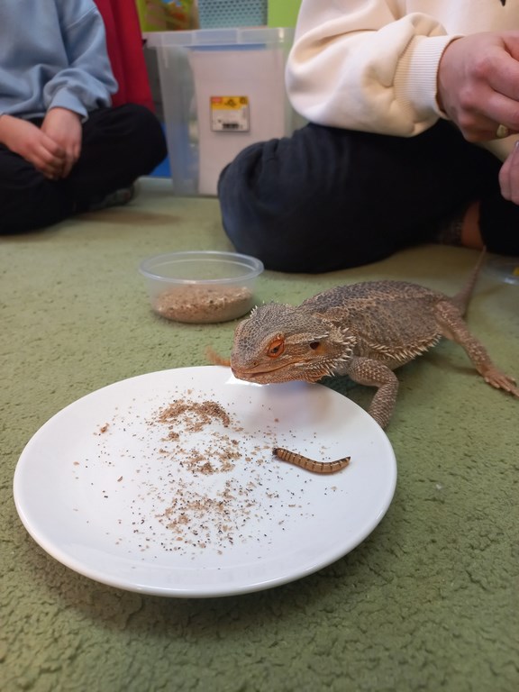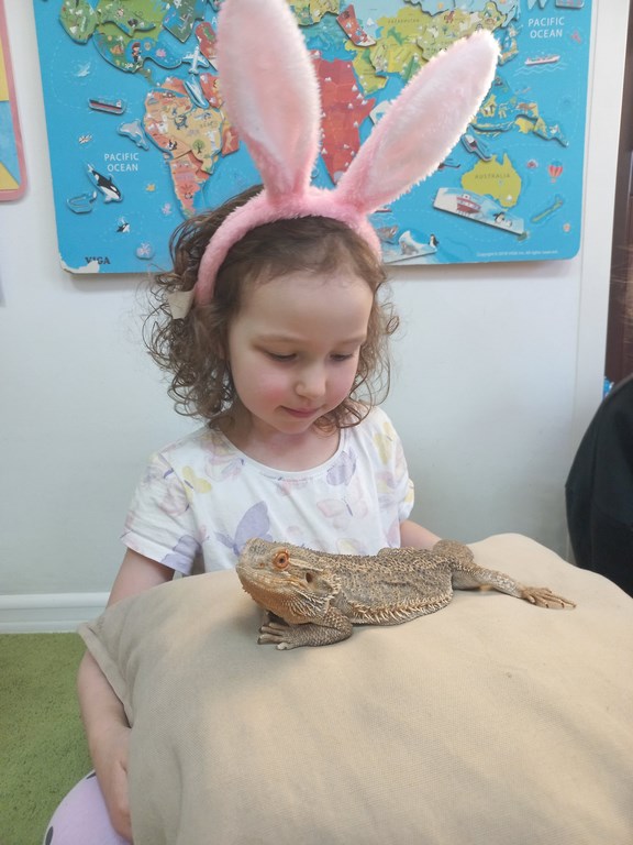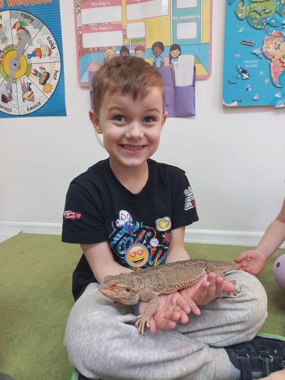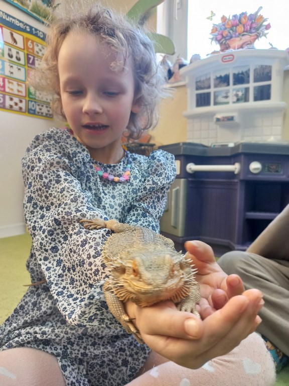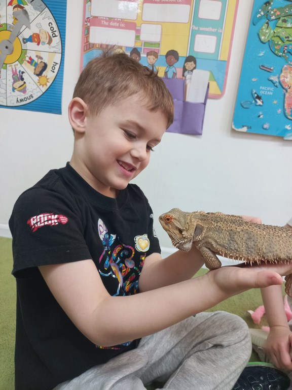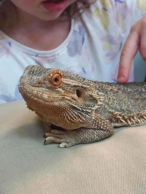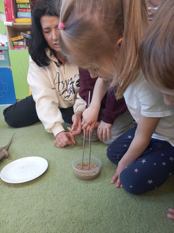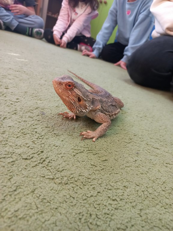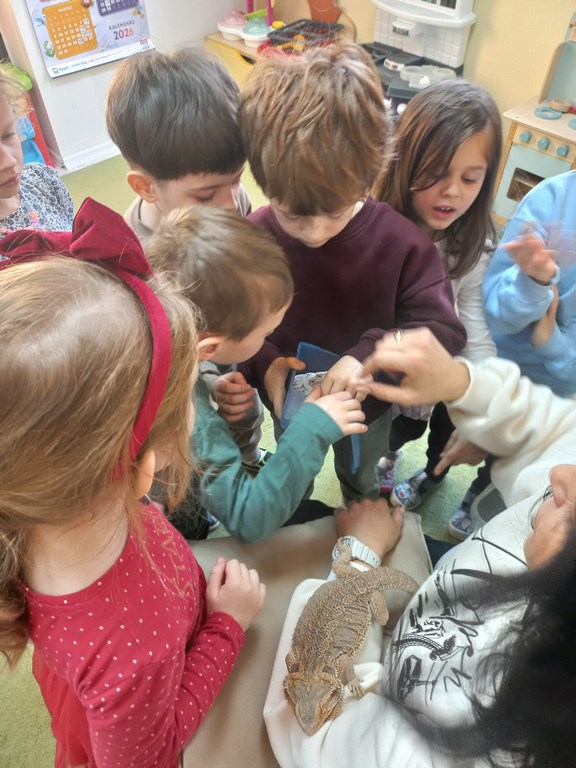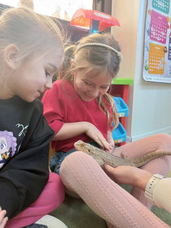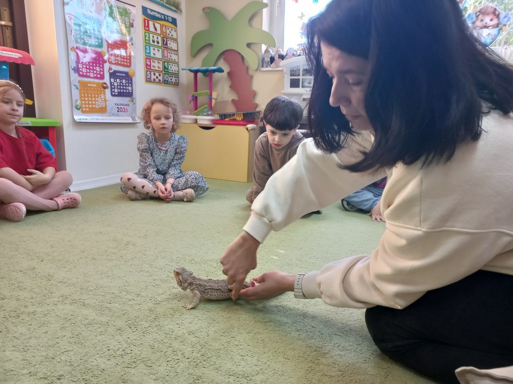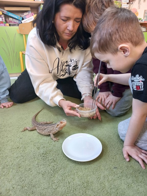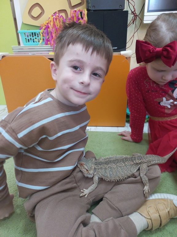 W naszym przedszkolu miało miejsce niezwykłe spotkanie z agamą brodatą. Przedszkolaki wykazały się ogromnym zainteresowaniem, ale jednocześnie były bardzo spokojne, delikatne i uważne w kontakcie ze zwierzątkiem. Z wielką uwagą słuchały ciekawostek i  przestrzegały wszystkich zasad bezpieczeństwa. Dziękujemy Filipkowi i mamie za tą cudowną przygodę ❤️ Wizyta sprawiła wiele emocji i radości, a także była cenną lekcją przyrody w praktyce.