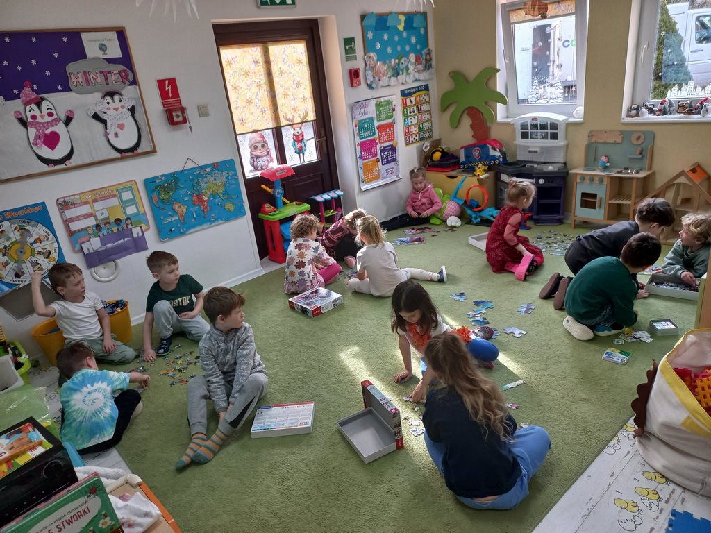 W przedszkolu obchodziliśmy Dzień Puzzli. Dzieci układały puzzle o różnym stopniu trudności, ćwicząc spostrzegawczość, cierpliwość oraz współpracę w grupie. Rozmawialiśmy o zasadach wspólnej zabawy i radości z osiągniętego celu. Zajęcia sprawiły dzieciom wiele radości i satysfakcji.
