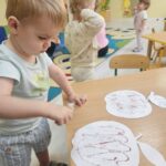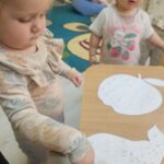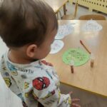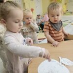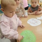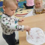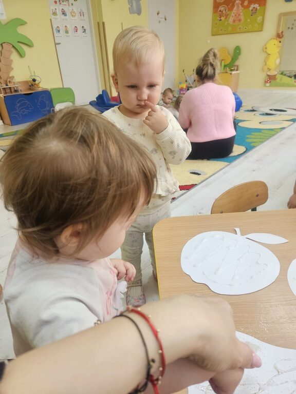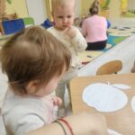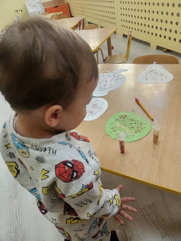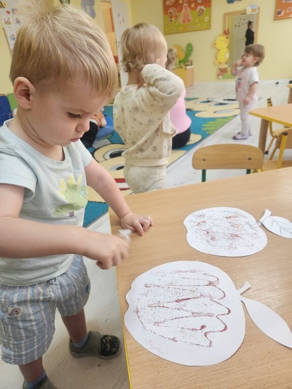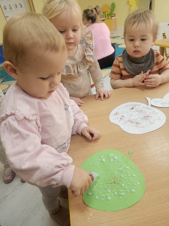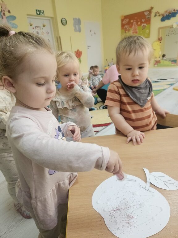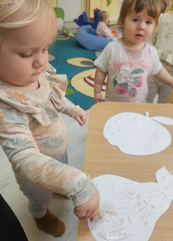 Wpadła gruszka do fartuszka, a za gruszką dwa jabłuszka….”  nasze kochane maluszki robiły dziś brokatowe jabłuszka i gruszki za pomocą magicznego kleju.