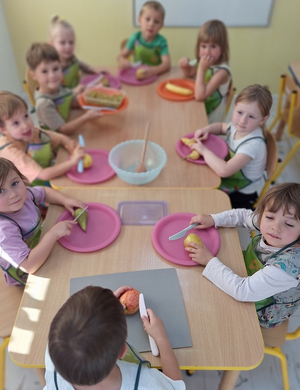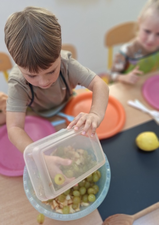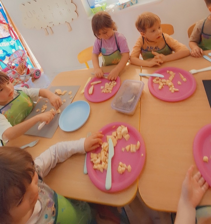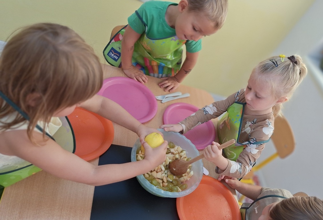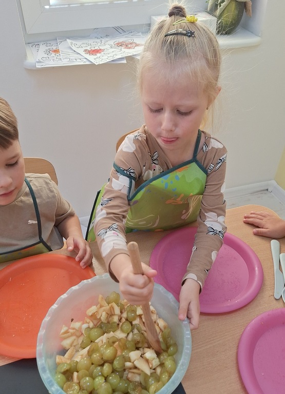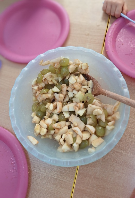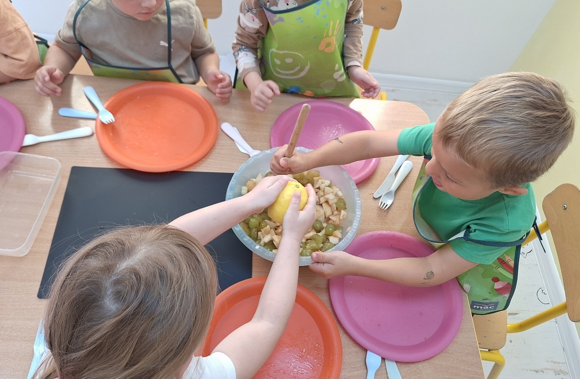 Tygryski kroiły owoce, z których wyszła  sałatka owocowa. Dzieci doprawiły sałatkę zdrową cytryną.Sałatka wykonana samodzielnie została cała zjedzona, a smakowała dzieciom przepysznie.