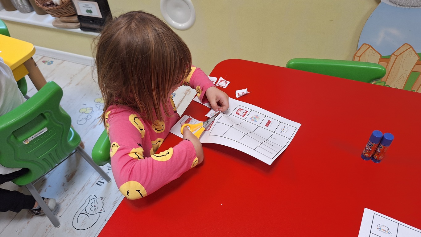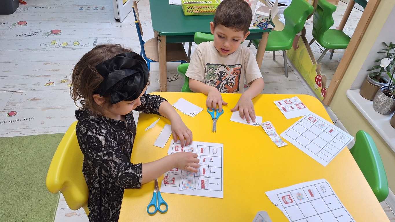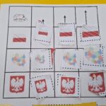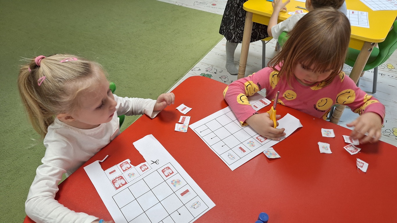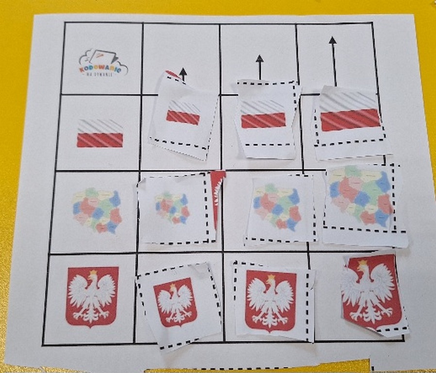 Patriotycznie zrobiło się u Tygrysków na zajęciach z kodowania.Dzieci wycinały i przyklejały obrazki w odpowiednich miejscach.