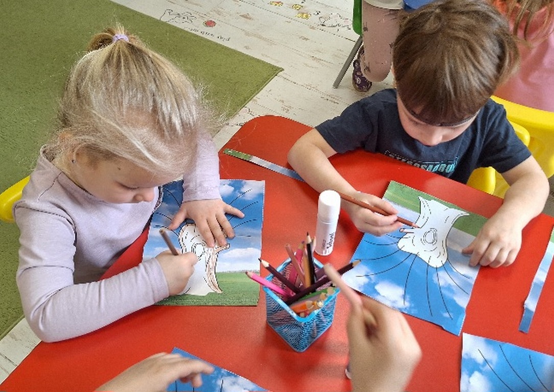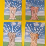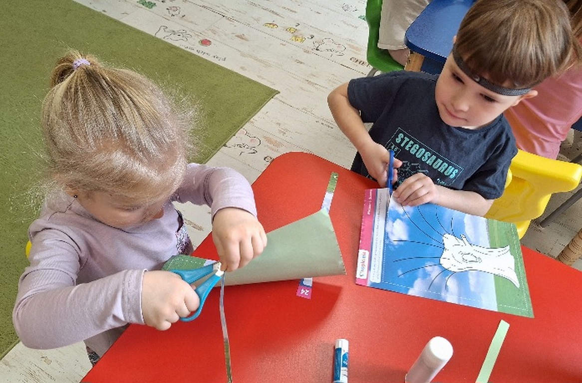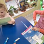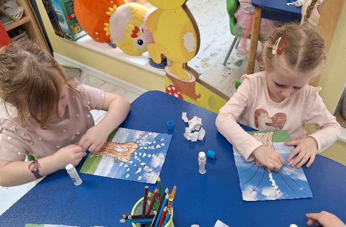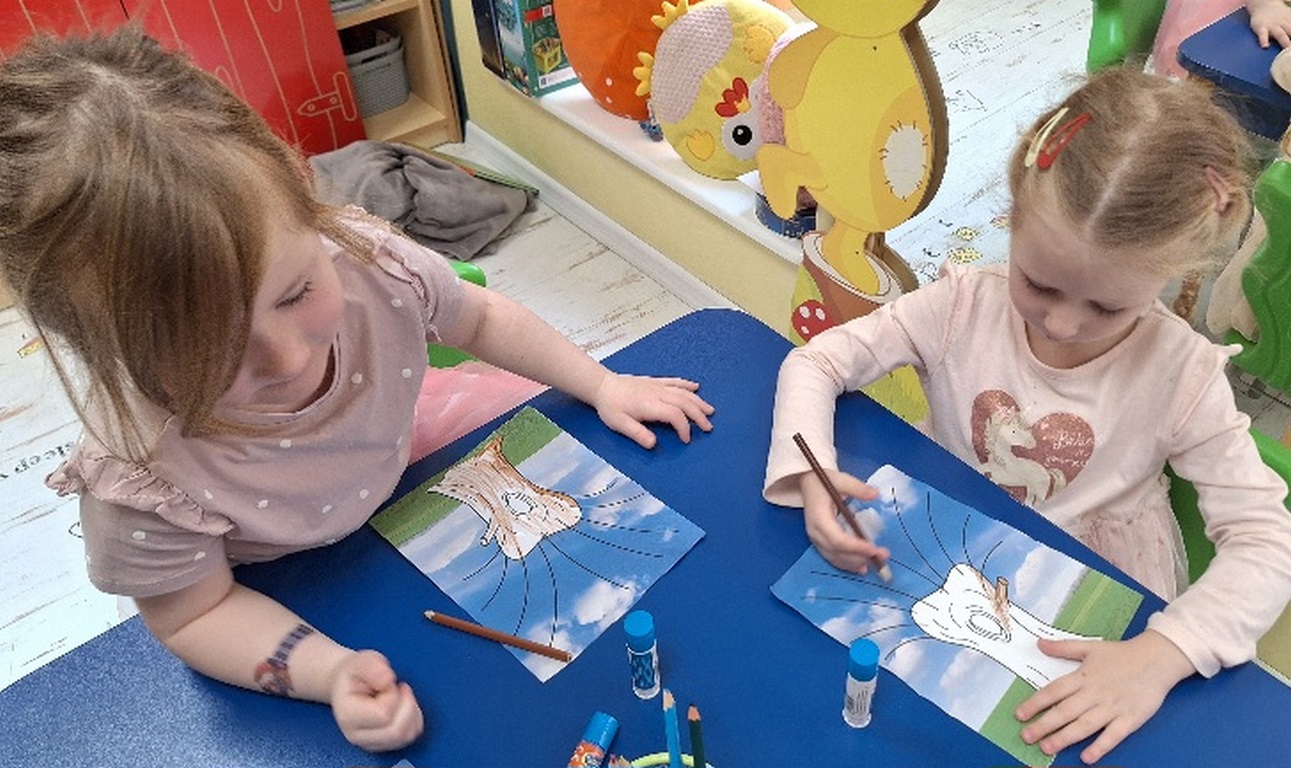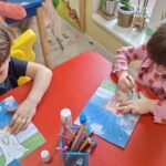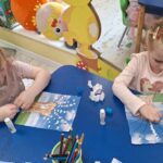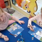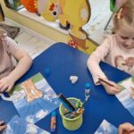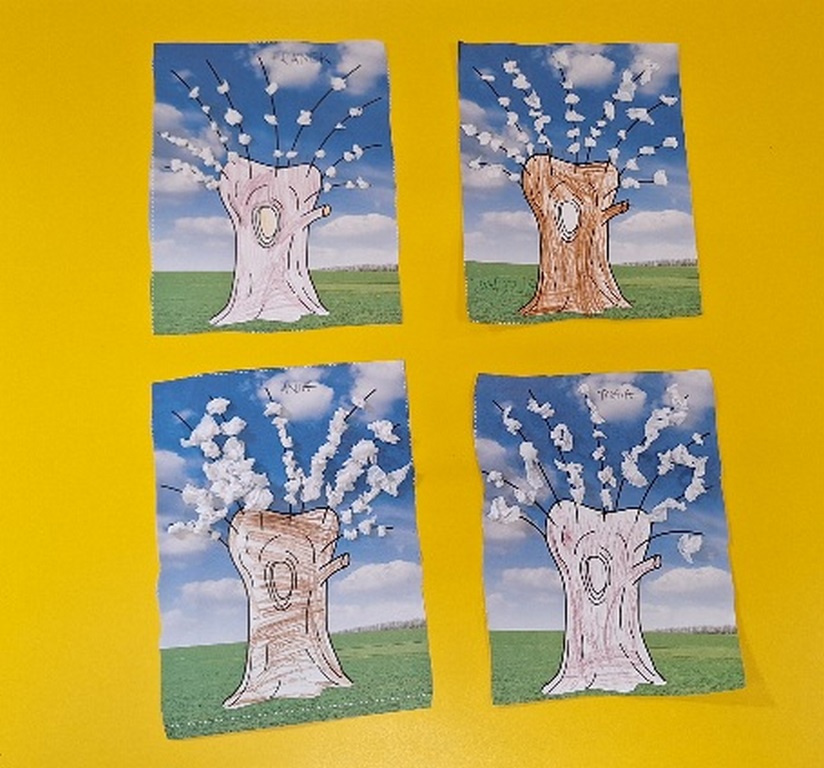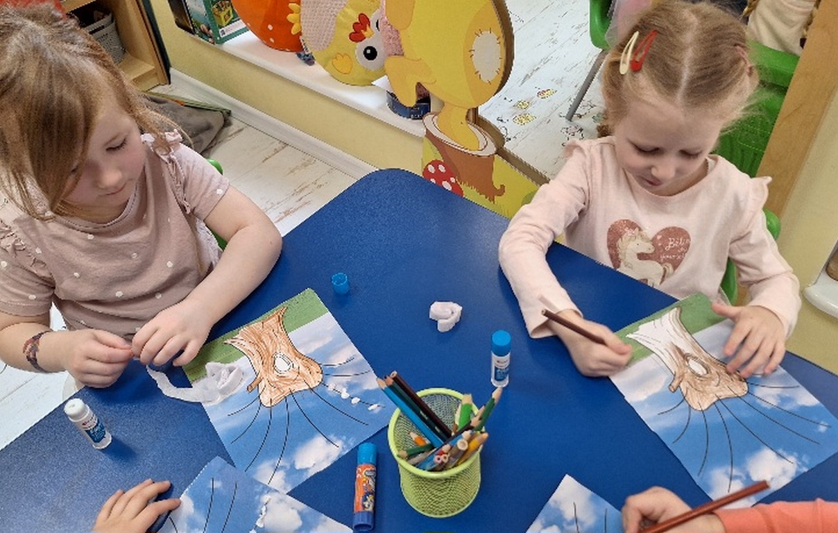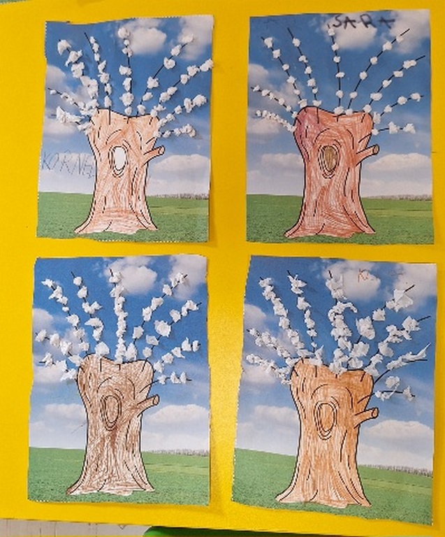 Pierwsza praca o tematyce tak długo oczekiwanej wiosny- Marcowe kotki. Dzieci wycinały, kolorowały i dolepiały bazie formowane z bibuły.