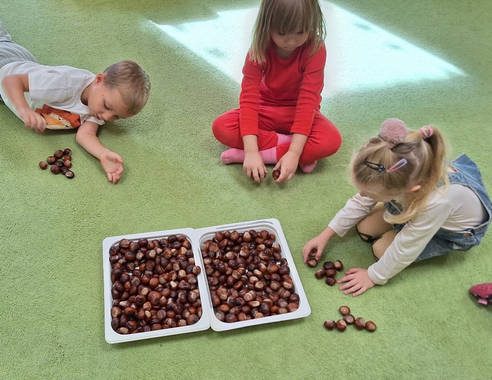 Można świetnie.bawić się kasztanami. Tygryski przeliczały, porównywały swoje kasztanowe kompozycje.