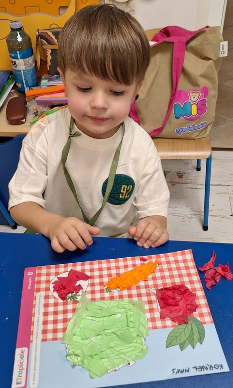 Dzieci wyklejały bibułą dobierając odpowiednie kolory warzyw. Prace wyszły przepięknie i przepysznie.