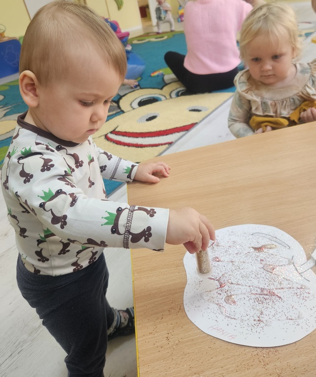 Wpadła gruszka do fartuszka, a za gruszką dwa jabłuszka...." nasze kochane maluszki robiły dziś brokatowe jabłuszka i gruszki za pomocą magicznego kleju.