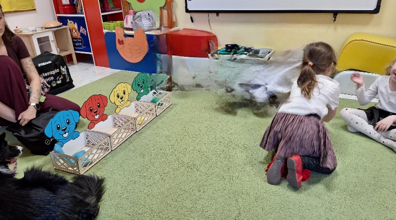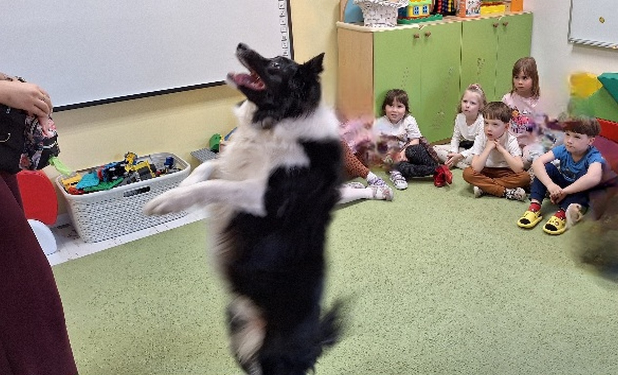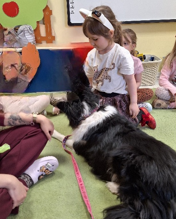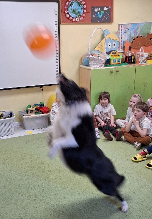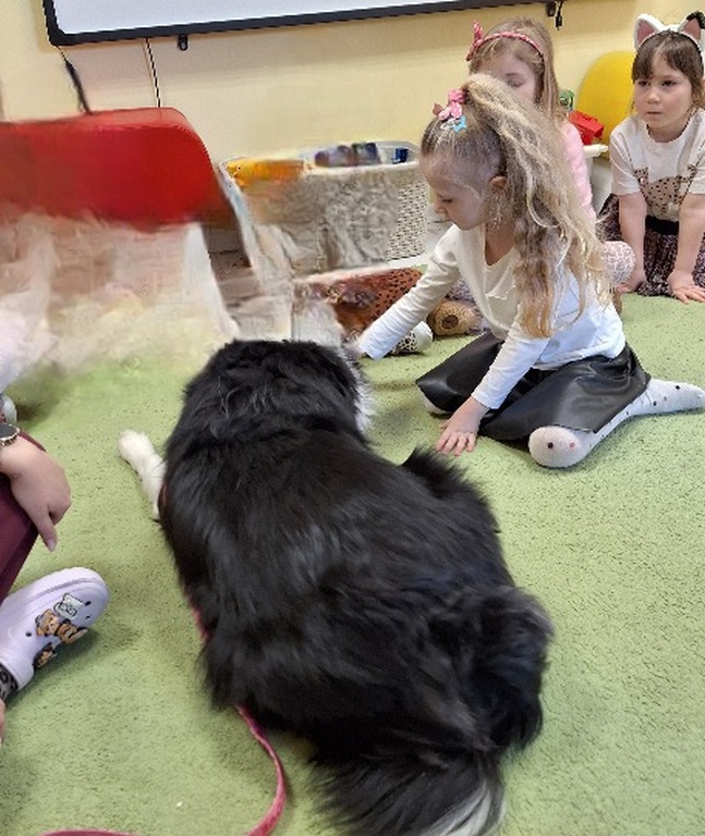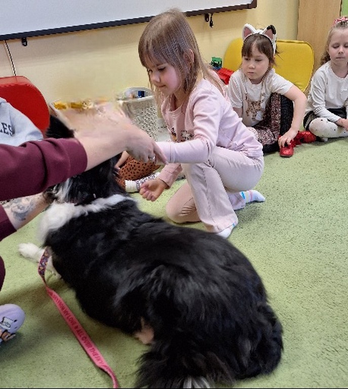 Kolejny raz Tygryski biorą udział w zajęciach z pieskiem.Coraz więcej dzieci przekonuje się do psów i chętnie bierze czynny udział we wspólnych zabawach.
