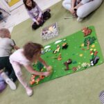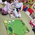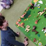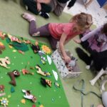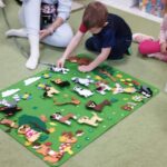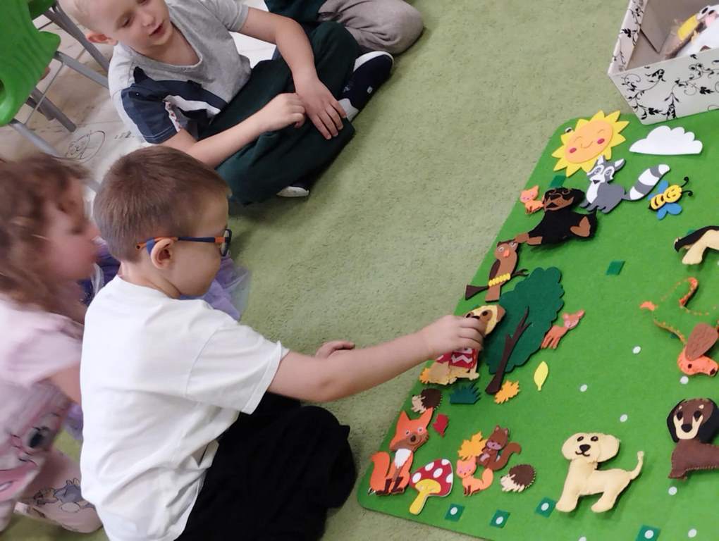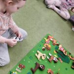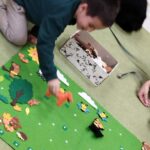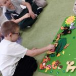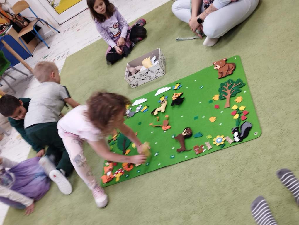 Tygryski wspólnie pokolorowały kartki  tworząc las, w którym poprzyklejały zwierzęta – mieszkańców lasu.