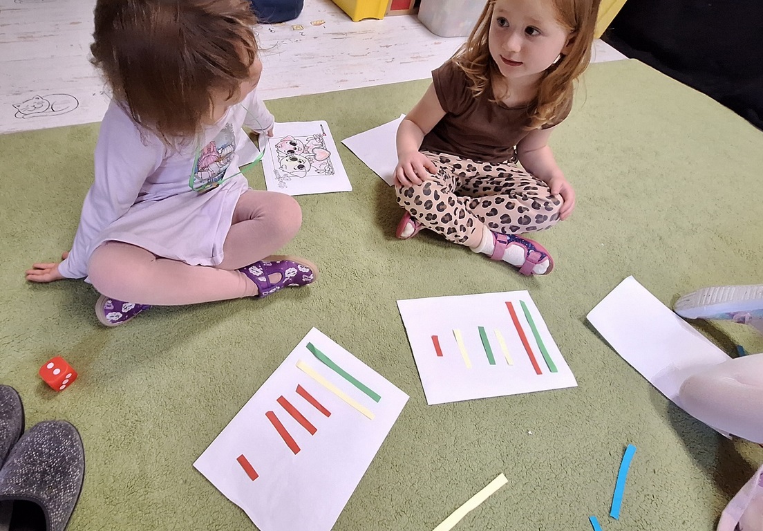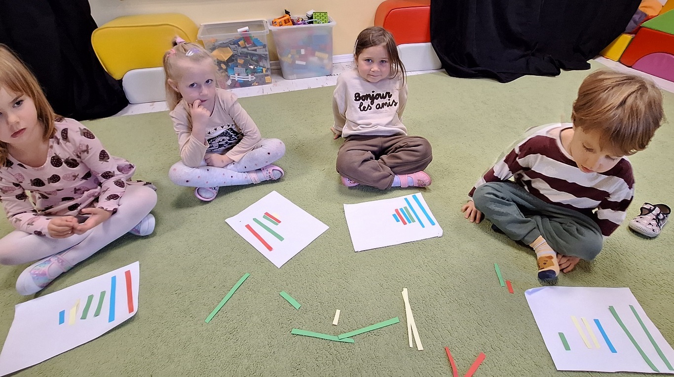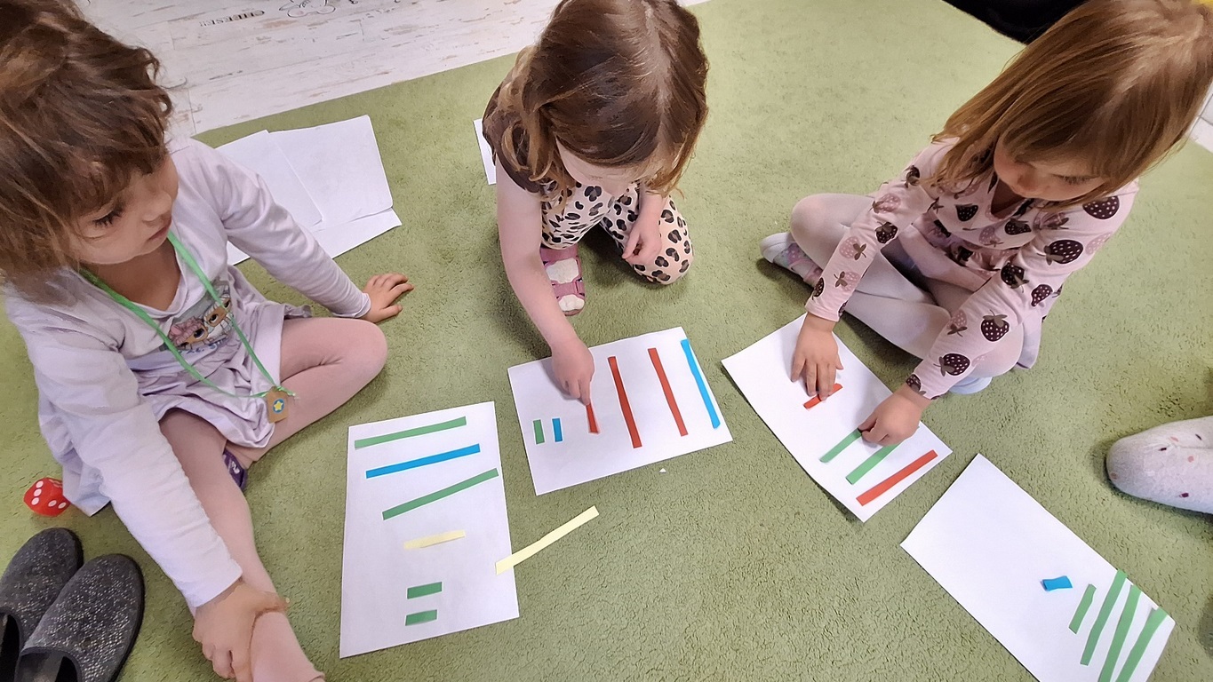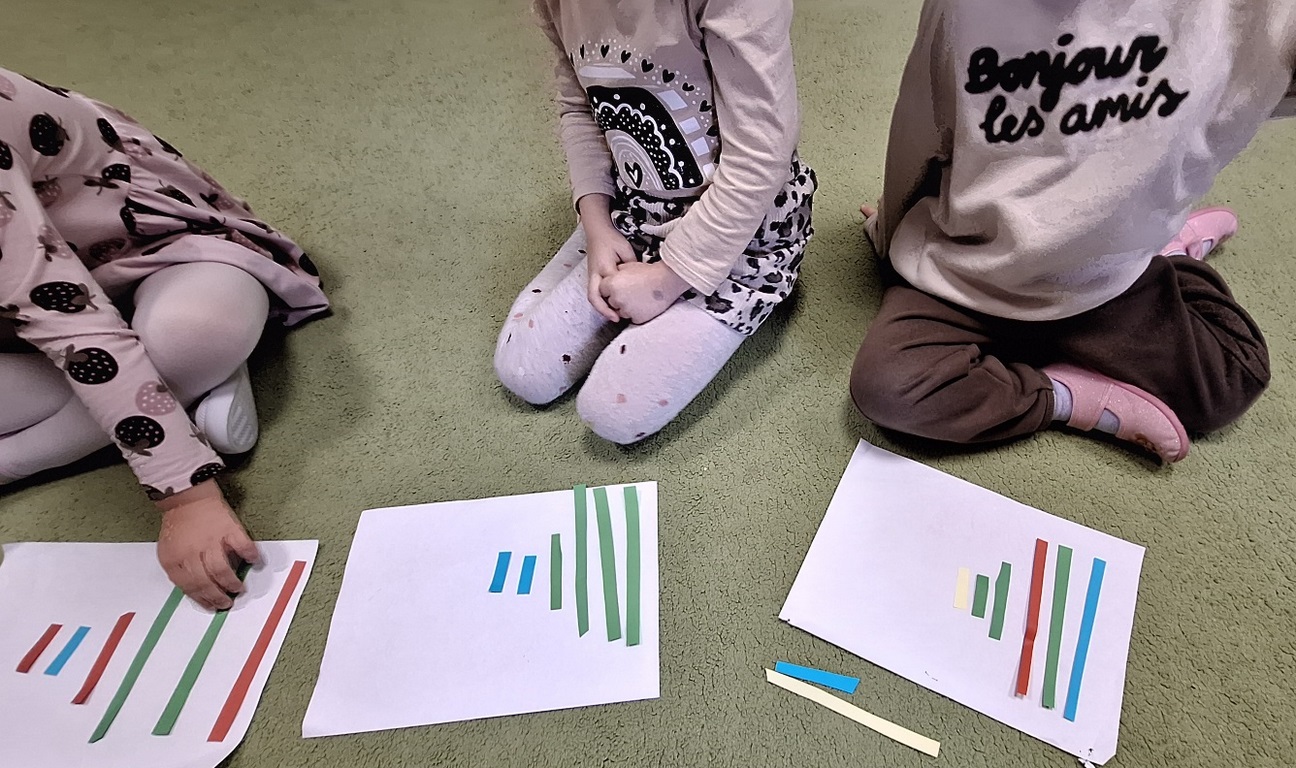 Dzieci segregowały, przeliczały i układały według poleceń nauczyciela paski według wielkości i według koloru.
