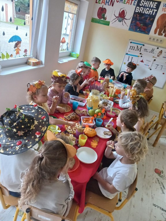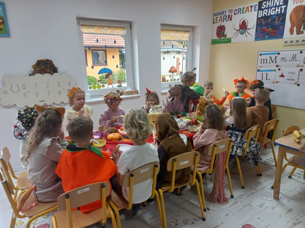 Dzisiaj w naszym przedszkolu odbył się Bal Jesienny, dzieci bawiły się, grały w gry po polsku i angielsku oraz tańczyły. Później zasiadły do pysznego poczęstunku, za który bardzo dziękujemy rodzicom. A wszystkim odwiedzającym naszą galerię życzymy miłego dnia.